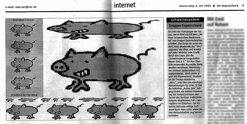 This is how the taz homepage looks if you modify it with the Swine-Fever bookmarklet. This script is available at student.merz-akademie.de/~drx/pigtures/ and replaces every picture on a webpage with the logo the Pig Impregnant Station Weser Ems uses for their male pig listing. Only true text is left, as web designers work for analphabets systematically. Espenscheid, student at the design Academy "Merz", is even more angry about the legal cases concerning hyperlinks. He is co-founder of the organization "Active Link" that slowed down the Ministry Of Justice's server last thursday with protest messages--at least a bit. Die software needed for this action is available at odem.org.